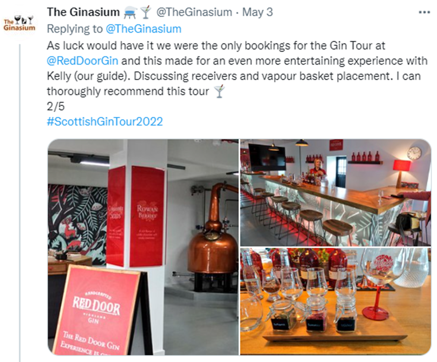 We were the only people on the RedDoor Gin Distillery tour at the Benromach distillery. It was a very chilled and relaxed affair with plenty of chances to taste the gins (one of us had to abstain, but we took the samples away in bottles). I even bought a very good organic Whisky (ie unpeated) which is made in the Benromach distillery on the same site.
