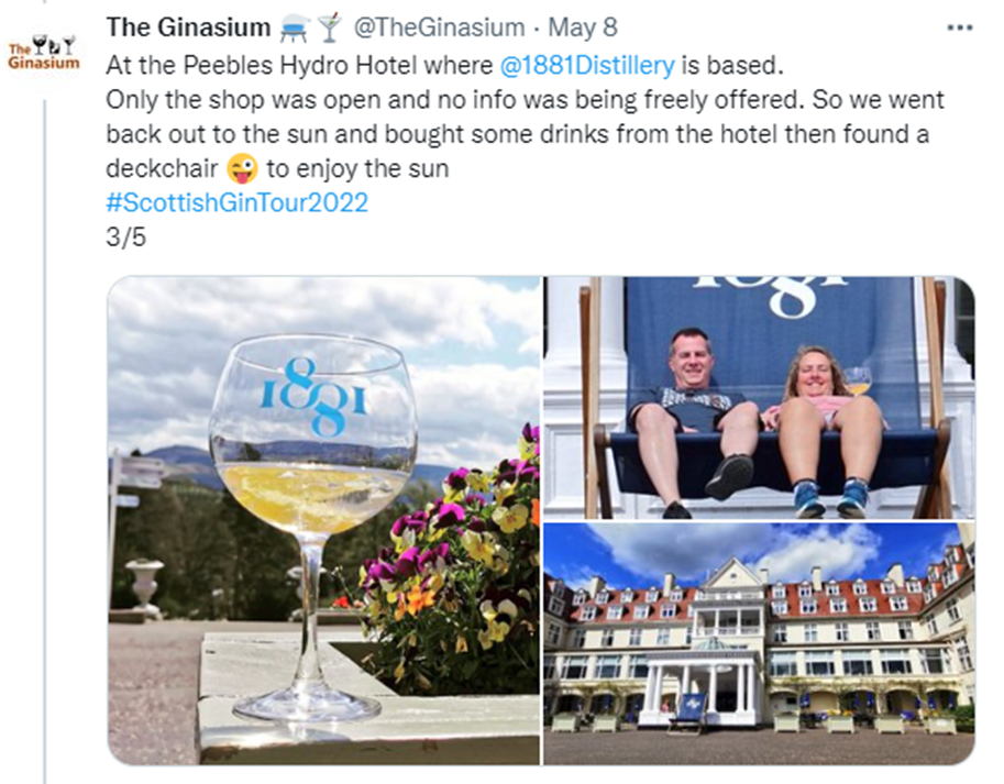 We stayed in Biggar over night but did not have the opportunity to visit the Distillery of the same name (perhaps next visit). Once again the weather turned sunny and we started to make our way south to Peebles, before our long drive back home. We parked the camper one side of Peebles and had quite a walk to the other end where the Peebles Hydro is located along with the 1881 Gin Distillery . Once again it was a Sunday so there were not many people to talk to but we made the most of the stunning views and location along with some Gin and Tonics.
