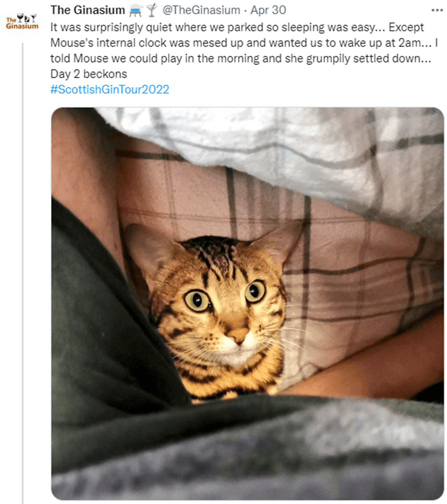 The plan was to take in some of the fine scenery, Gin, and meet people that we had spoken to on line for the last few years. There would be 3 of us on the trip Me, my wife and our house cat (Mouse) and so we decided to hire a reasonably large camper van with a generous storage area in the back – we took bikes with us but never used them. We were very glad of the storage space to house Mouse’s cat wheel and the Gin trophies that we ‘scalped’ as we progressed on our trip. If Mouse had not been with us we might have driven up by car and hired ‘the beastie’ in Scotland, but this was not really an option.