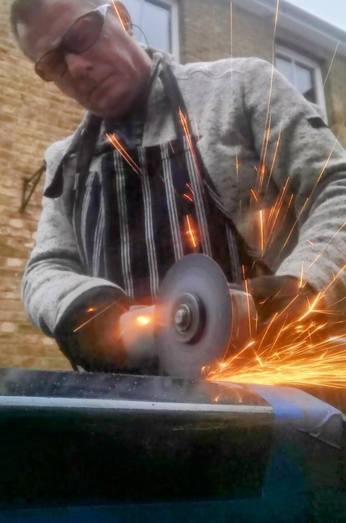 I could have opted to simply cut a hole in one side of the can, but this would have limited the space inside. So I opted to cut down the main seam using a cutting disk on my angle grinder, I also tried a small hobby cutter but that did not have the power. Gloves, safety goggles, apron and ear plugs were all employed as this created plenty of theatrical sparks. Cutting the curve was harder but was made with lots of little cuts. Although I knew the protective edge would hide some errors, I did not have much room for error.