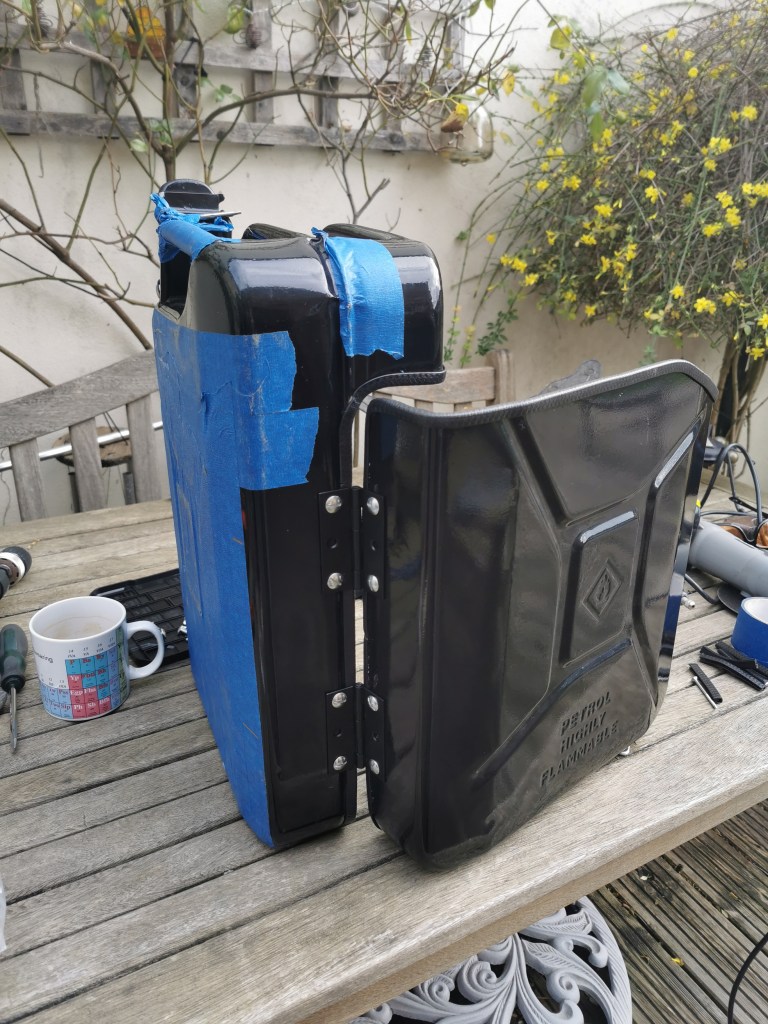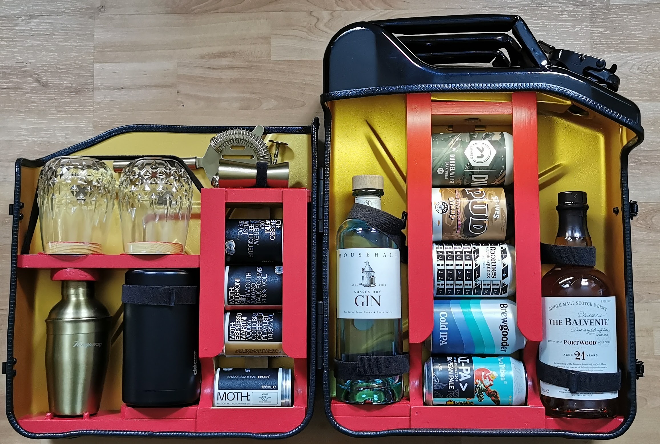 My wife and I sometimes go to car ‘meet ups’ and take a picnic with us. I had seen online some examples of mini-bars that had been made out of 20l jerry cans and so thought I could make one for us to take that could be used for both food and drink.