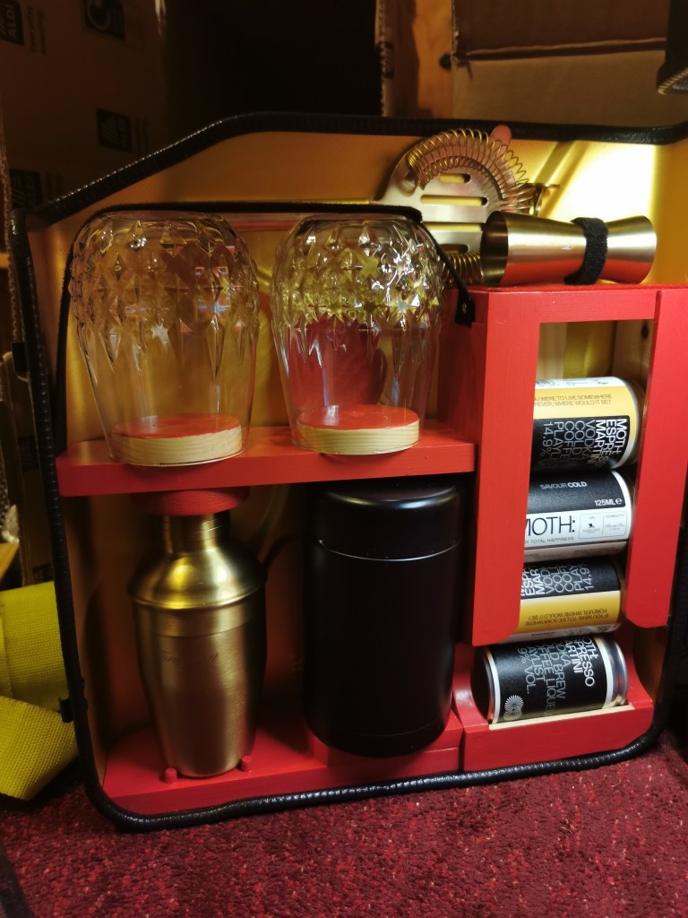 I manged to squeeze in all that I wanted with a pair of glasses and space for a shaker, jigger, bar spoon, strainer, insulated container for ice, 2 full sized bottles of spirits, 4 smaller cans of mixers/RTD cocktails and 5 standard stubby cans of beer/soft drink. I should add that fully loaded it is very heavy – it is likely only to hold a couple of cans and a single bottle of spirits and the ace holder, with the rest of the space taken up with picnic food when it is used in anger.