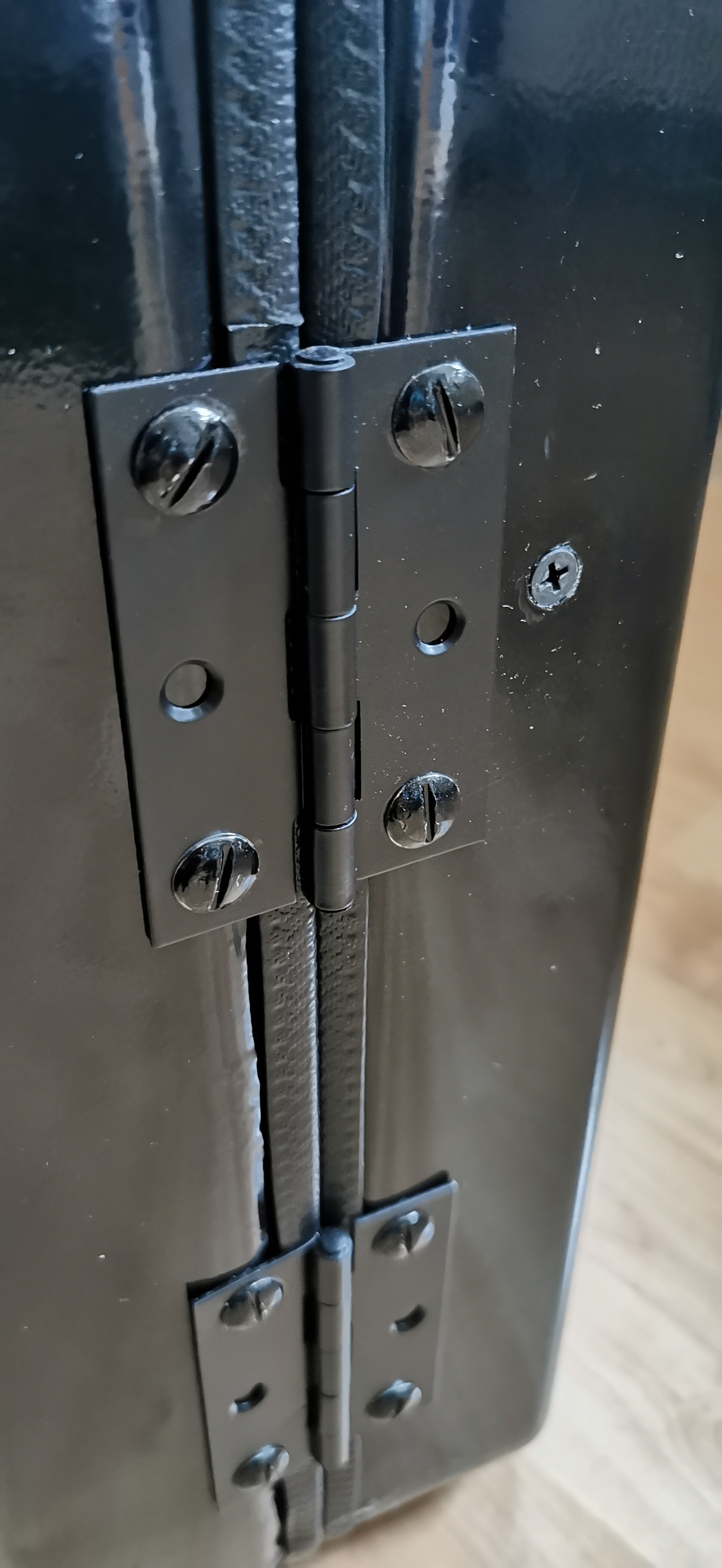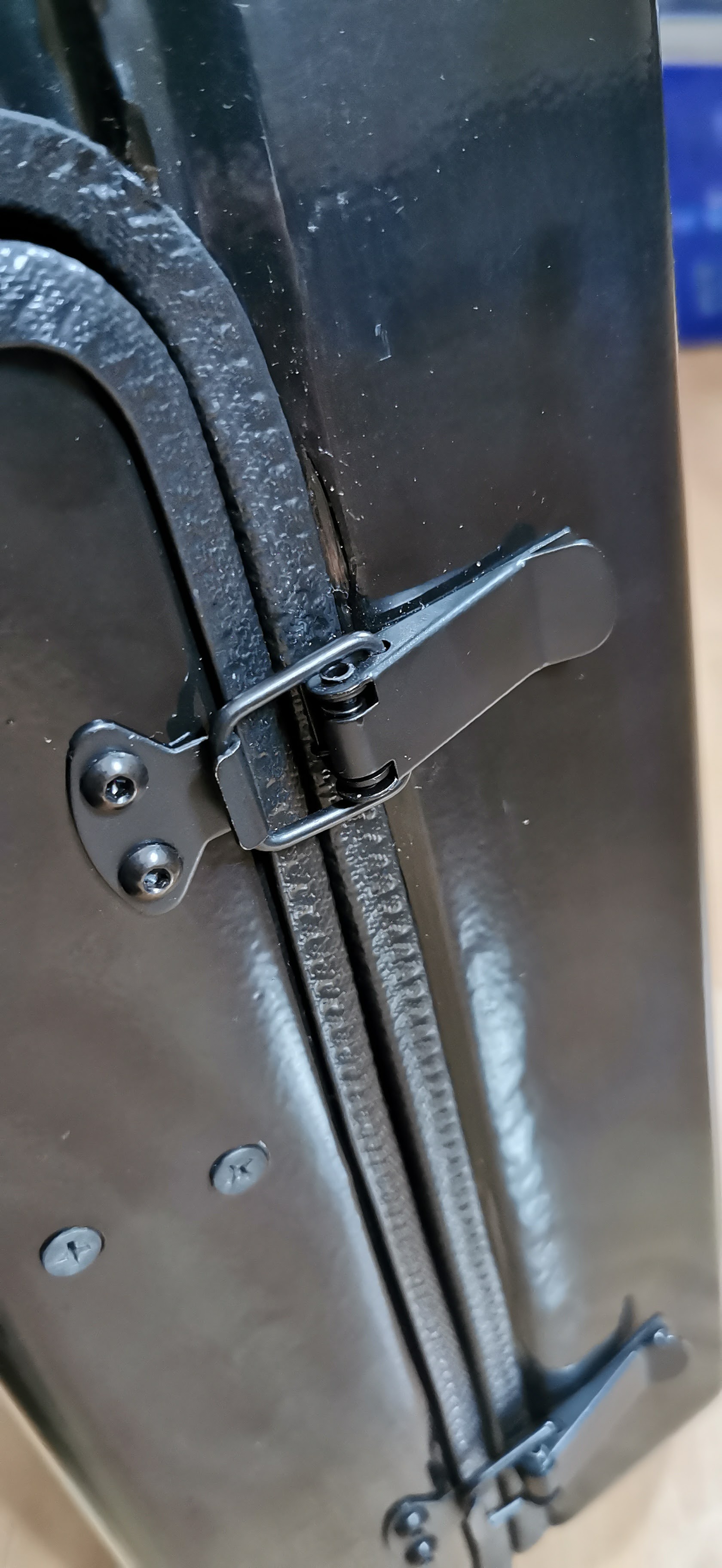 Next was to fit the protective strip, the hinges and the catches. This was fairly straight forward with only a little extra metal to remove so it closed perfectly with the extra bulk of the protective strip. I had some aluminium short bolts that fitteet the hinges perfectly and painted the heads black at the end.